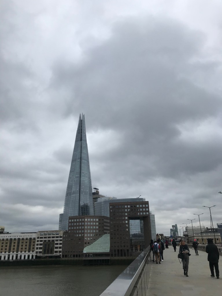So from the bridge the shadow’s tip was just north of a line connecting the north tower of Tower Bridge with the bridge of HMS Belfast. That’s one pair. Scooting south to the walkway I could just about see, three minutes later than 1pm, the shadow’s gap pointing to the right side of Adelaide House. Maybe just enough to triangulate with…