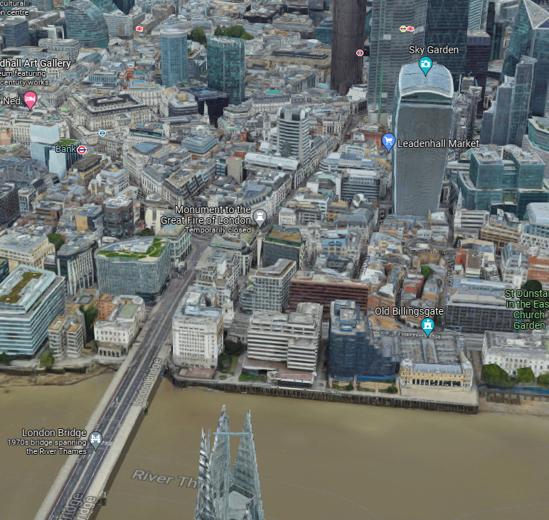 Google Maps fortunately has a handy 3D feature, where you can pick your point of view and rotate and zoom your way around the City, all still handily marked up. So you can recreate pretty much exactly this view. I mean: