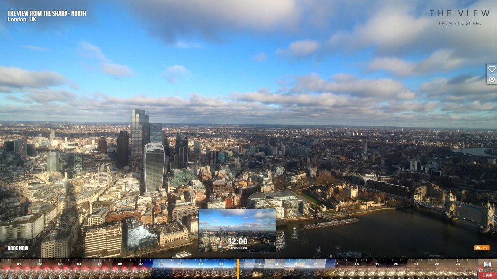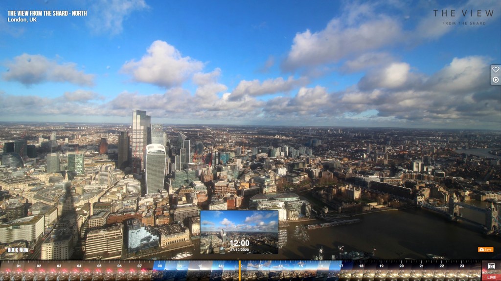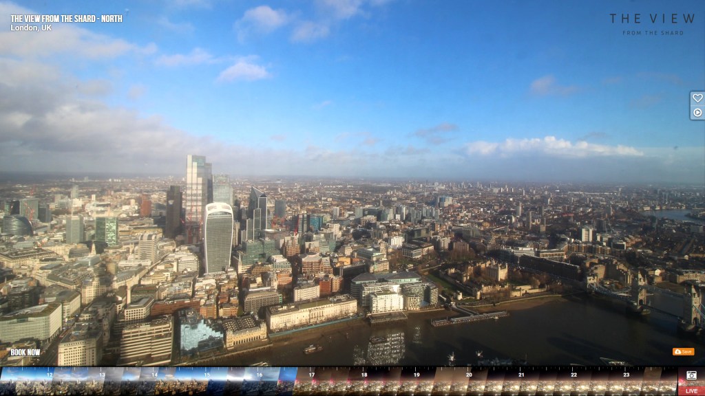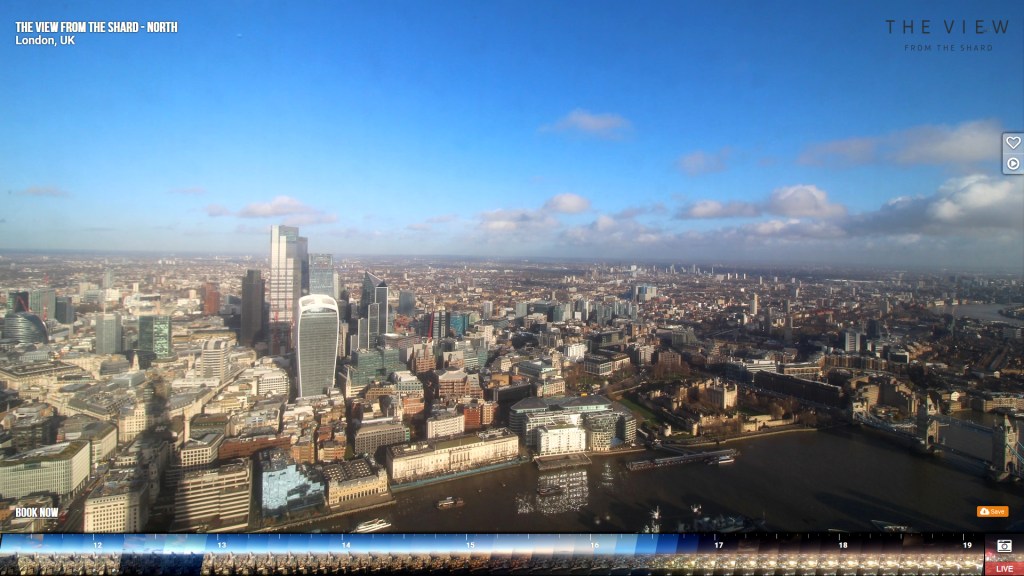 After a few cloudy days this counts as another lucky shot, with the east of the city under deep dark shadow there. But unlike the last, this day cleared up and I actually left the flat for a very cold walk along the river at Wapping in fast-fading orange light. It stayed clear and bitter all evening and that night the pond froze. A good time to rely on webcams.
